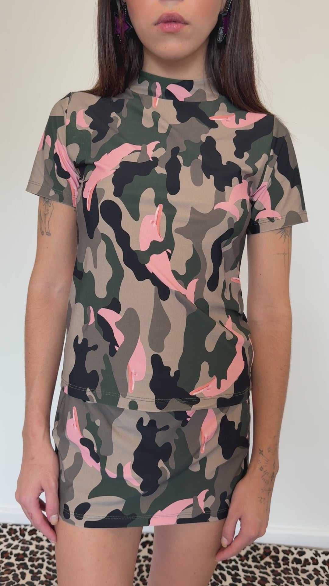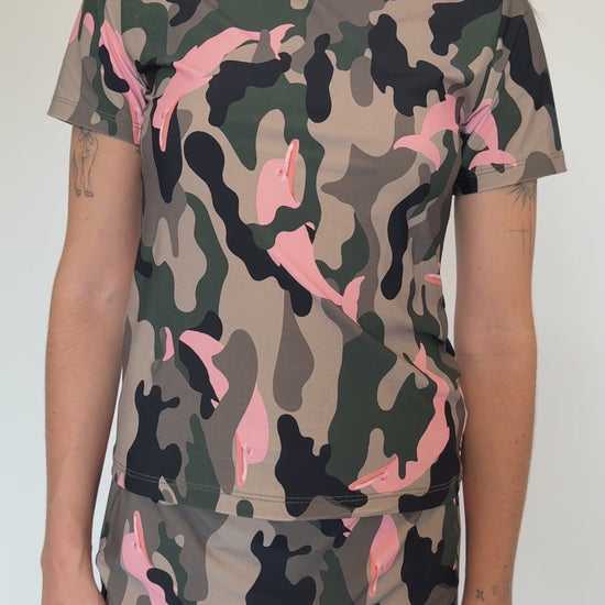 Blusa de manga curta e gola média, feita em lycra premium com estampa camuflada exclusiva e golfinhos rosa. Versátil, ajustada ao corpo e perfeita para compor looks urbanos ou de praia. Possui proteção uv 50+ contra raios ultravioleta.