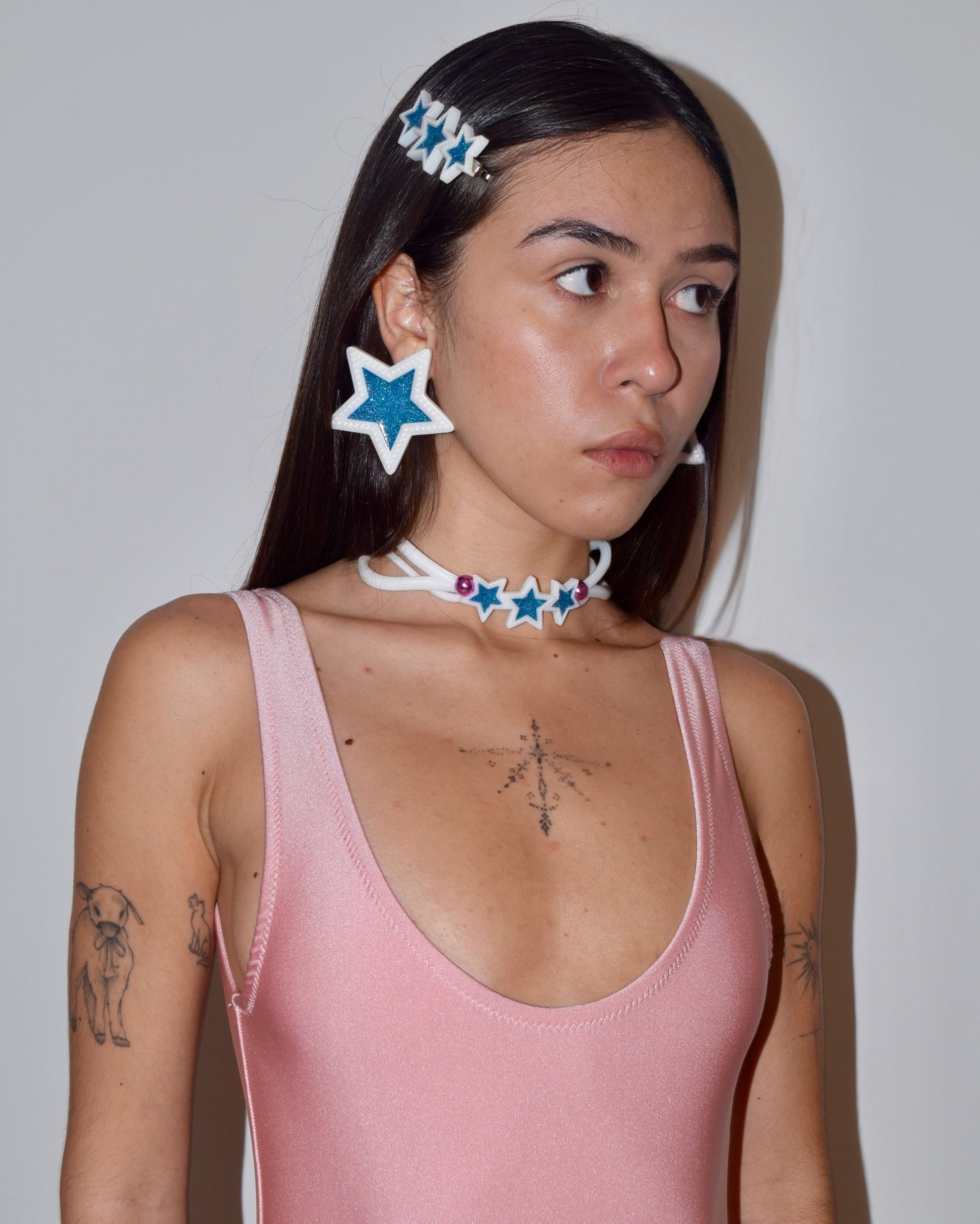 Os Brincos Haniel’s Ear Pods trazem a estrela como símbolo central da 44, reinterpretada em uma versão vibrante e contemporânea.